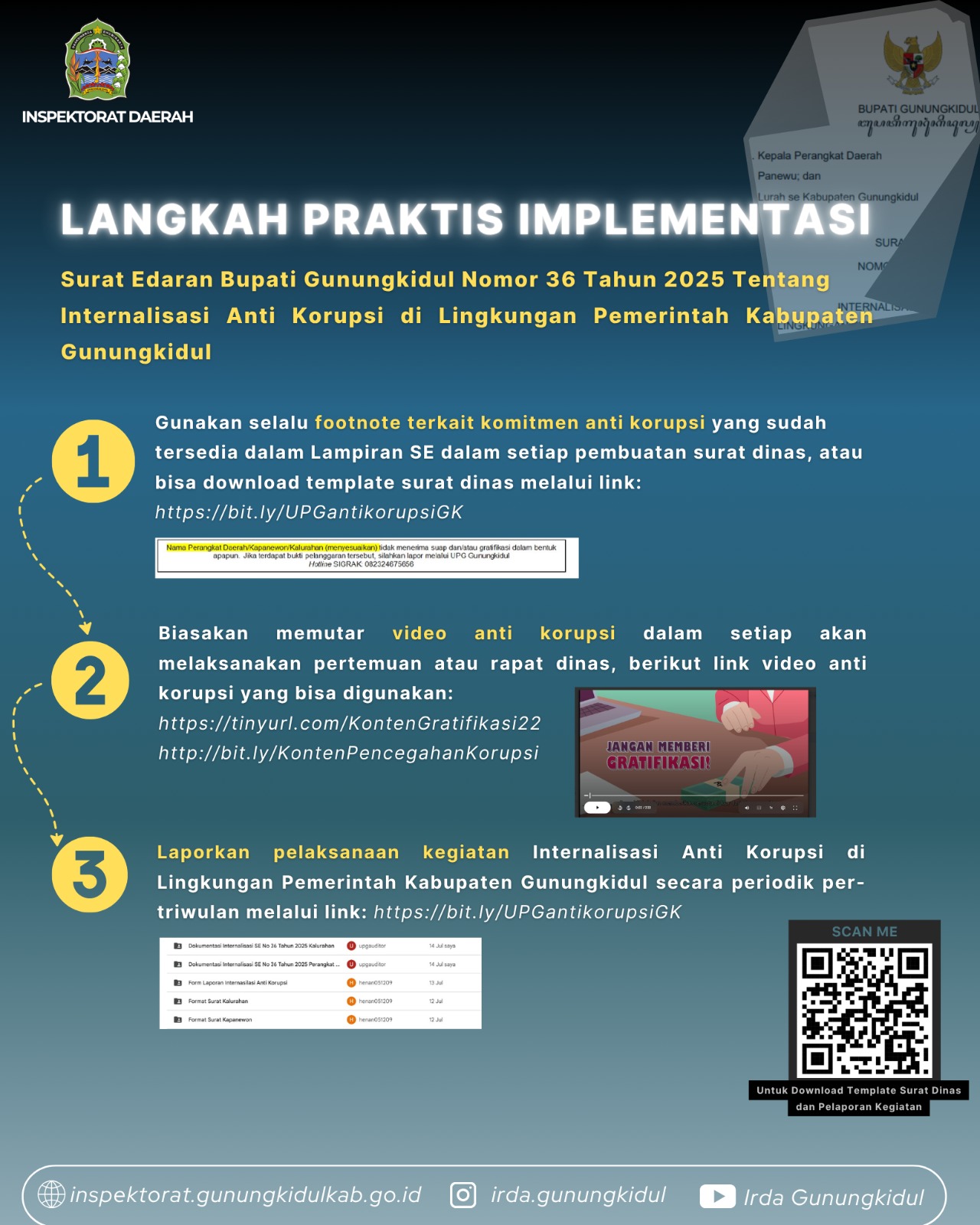 - Laporkan pelaksanaan kegiatan Internalisasi Anti Korupsi di Lingkungan Pemerintah Kabupaten Gunungkidul secara periodik per-triwulan melalui link: https://bit.ly/UPGantikorupsiGK.