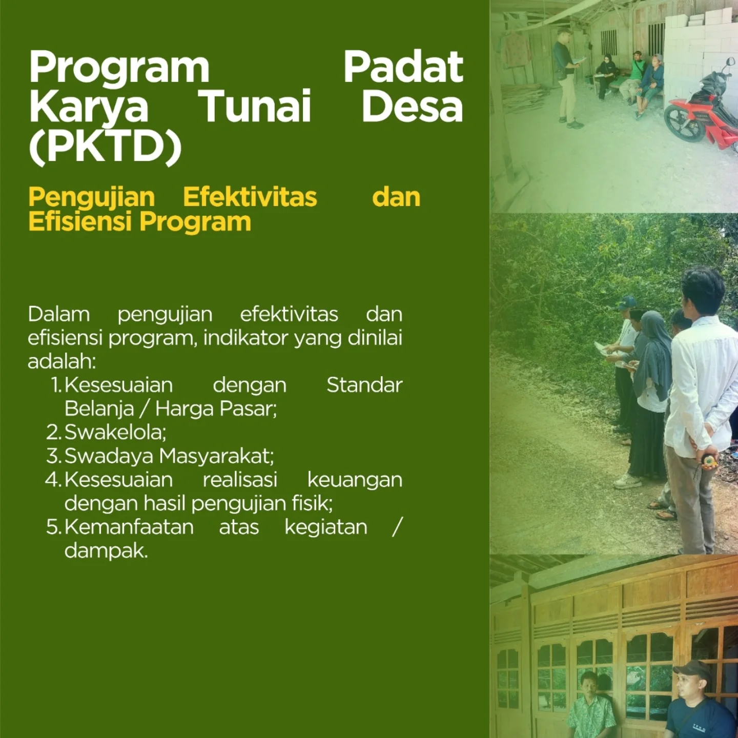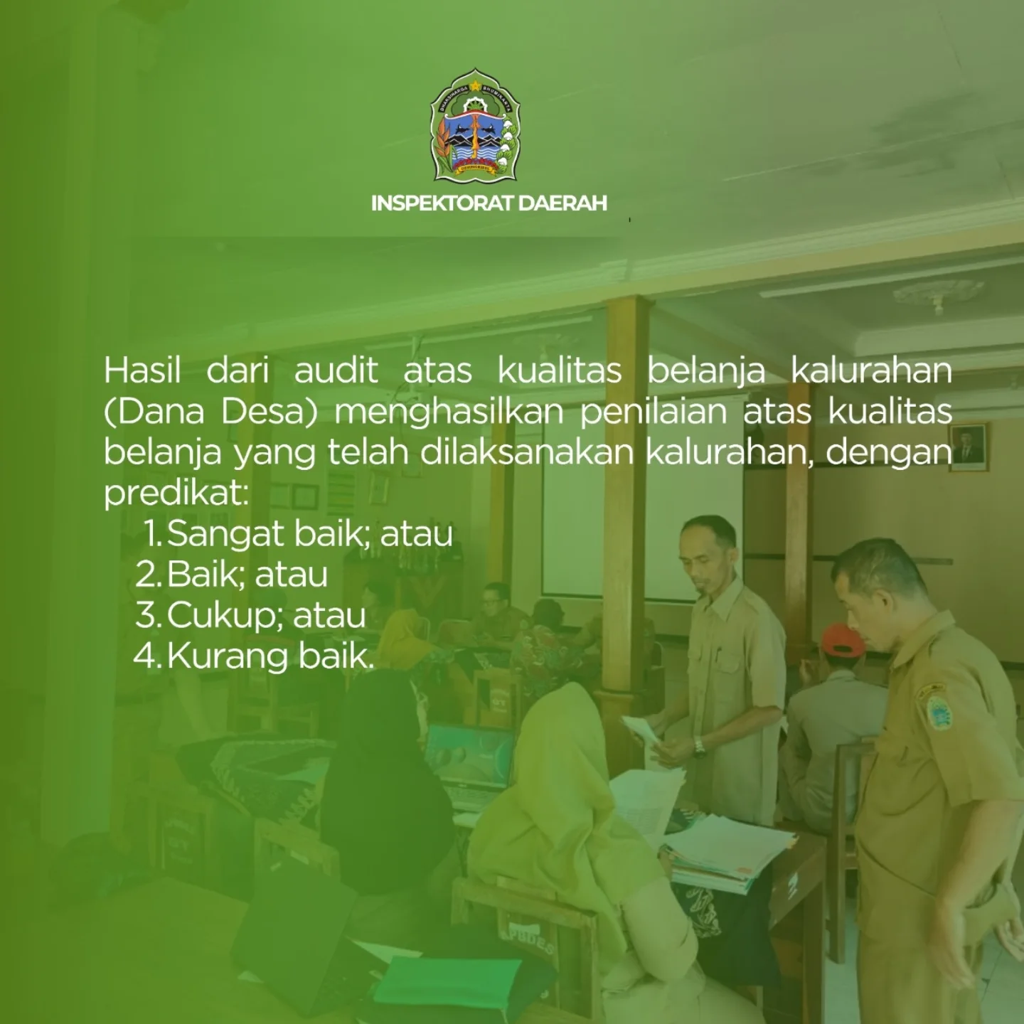 Dalam rangka mewujudkan transparansi, akuntabilitas, tertib dan disiplin anggaran, serta partisipasi dalam pengelolaan keuangan kalurahan, Inspektorat Daerah Kab. Gunungkidul melaksanakan pengawasan pengelolaan keuangan desa, salah satunya dalam bentuk audit terkait kualitas belanja kalurahan.