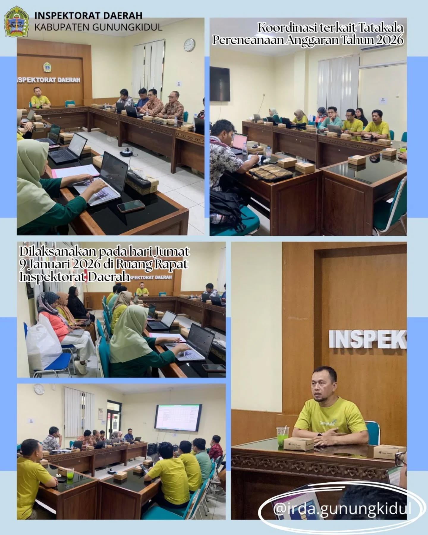 Wonosari, Jumat (09/01/2026) — Dalam upaya menyamakan persepsi dan memperkuat koordinasi lintas Perangkat Daerah (PD) dalam rangka menjamin ketepatan waktu serta kualitas pelaksanaan reviu perencanaan anggaran tahun 2026, Inspektorat Daerah bersama Bappeda dan BKAD, melaksanakan Rapat Koordinasi terkait Tatakala pelaksanaan Perencanaan Anggaran Tahun 2026 pada Jumat, 9 Januari 2026, bertempat di Ruang Rapat Inspektorat Daerah Kabupaten Gunungkidul.
