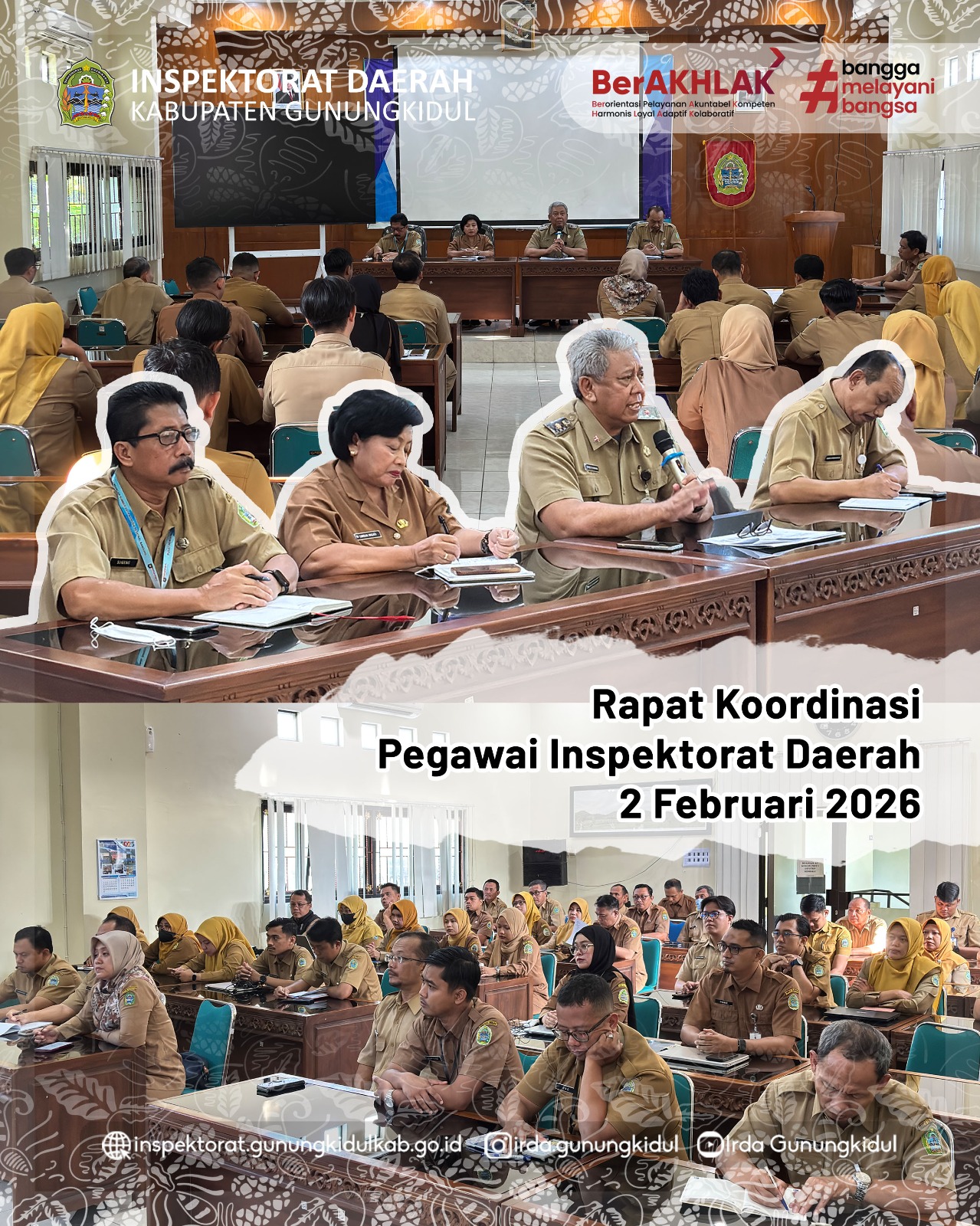 Wonosari, Senin (02/02/2026) — Inspektorat Daerah Kabupaten Gunungkidul melaksanakan Rapat Koordinasi Awal Tahun 2026 pada Senin, 2 Februari 2026. Kegiatan ini menjadi momentum awal untuk menyamakan persepsi, memperkuat komitmen, serta meneguhkan semangat kerja seluruh Aparatur Sipil Negara (ASN) di lingkungan Inspektorat Daerah dalam menghadapi pelaksanaan tugas pengawasan sepanjang tahun 2026.