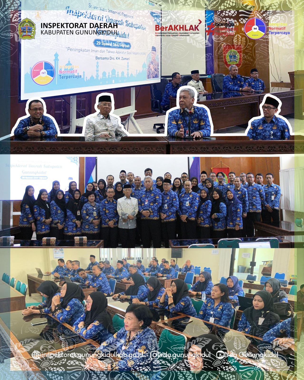 Wonosari, Jumat (17/04/2026) – Pengajian Syawalan internal diselenggarakan sebagai upaya untuk meningkatkan keimanan dan ketakwaan Aparatur Sipil Negara (ASN) serta mempererat silaturahmi antarpegawai di lingkungan Inspektorat Daerah Kabupaten Gunungkidul.