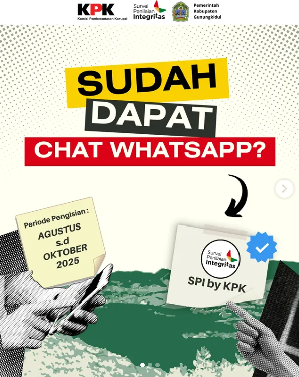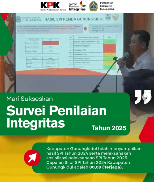 📣Ayo jadi bagian dari perubahan! Survei Penilaian Integritas (SPI) 2025 telah dibuka. Ini bukan sekadar survei biasa, tapi wujud nyata kepedulian kita terhadap tata kelola pemerintahan yang bersih, transparan, dan bebas dari praktik korupsi. Pemerintah Kabupaten Gunungkidul mengajak seluruh elemen masyarakat untuk ikut serta mengisi SPI. Jangan ragu dan jangan khawatir karena: 📲 Konfirmasi survei […]