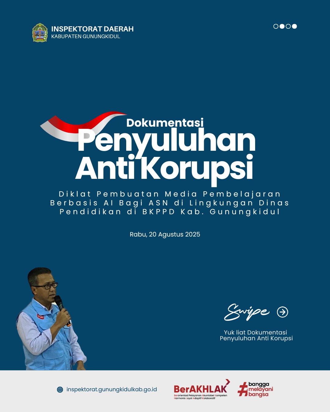 Wonosari, Rabu (20/08/2025) – Inspektorat Daerah Kabupaten Gunungkidul menugaskan Prananto, ST., M.AP sebagai Narasumber Penyuluhan Anti Korupsi Bagi Peserta Diklat Pembuatan Media Pembelajaran Berbasis AI Bagi ASN di Lingkungan Dinas Pendidikan yang diselenggarakan oleh Badan Pendidikan, Kepegawaian dan Pelatihan Daerah Kabupaten Gunungkidul pada hari Rabu, 20 Agustus 2025. Peserta diklat berjumlah 30 orang yang merupakan guru […]