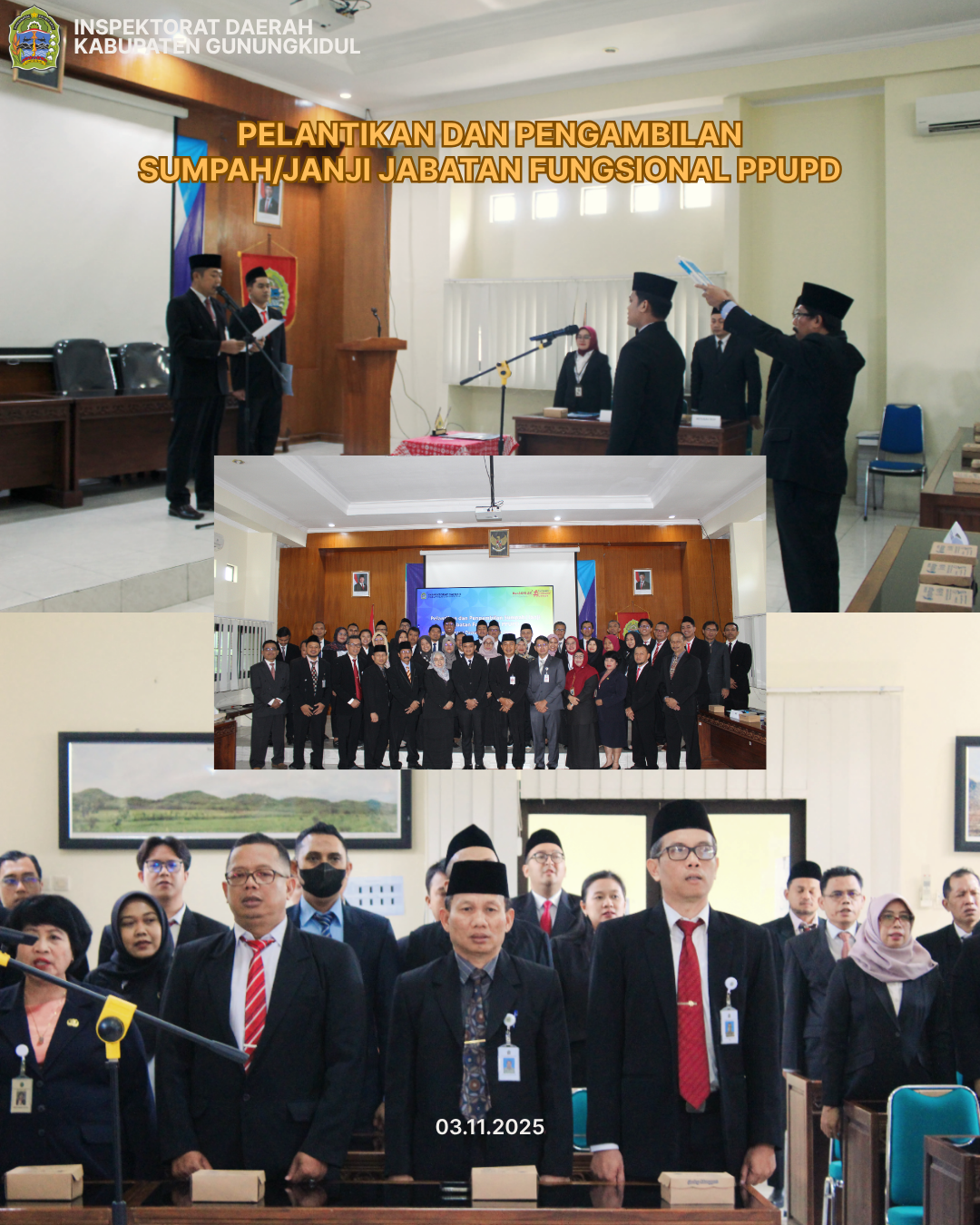 Wonosari, Senin (03/11/2025) — Inspektorat Daerah Kabupaten Gunungkidul melaksanakan kegiatan Pelantikan dan Pengambilan Sumpah/Janji Jabatan Fungsional Pejabat Pengawas Urusan Pemerintahan Daerah (PPUPD) pada Inspektorat Daerah. Kegiatan ini berlangsung di Ruang Rapat Inspektorat Daerah Kabupaten Gunungkidul. Pelantikan dipimpin oleh Inspektur Daerah Kabupaten Gunungkidul, Saptoyo, S.Sos., M.Si., dan dihadiri oleh Kepala BKPPD, Iskandar, S.IP., MPA., Sekretaris BKAD, […]