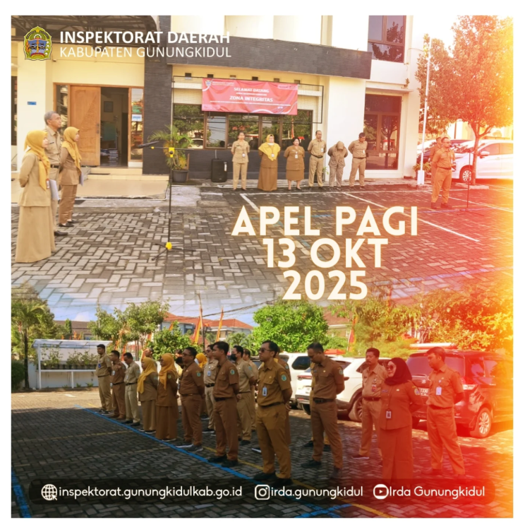 Wonosari, Senin (13/10/2025) — Inspektorat Daerah Kabupaten Gunungkidul melaksanakan apel pagi rutin di halaman kantor setempat. Apel pagi dipimpin oleh Bapak Arif Kuncahya, S.IP., Inspektur Pembantu (Irban) Bidang Investigasi, yang bertindak sebagai pembina apel. Apel berlangsung dengan tertib dan khidmat, diikuti oleh seluruh Aparatur Sipil Negara (ASN) dan pegawai non-ASN di lingkungan Inspektorat Daerah Kabupaten […]