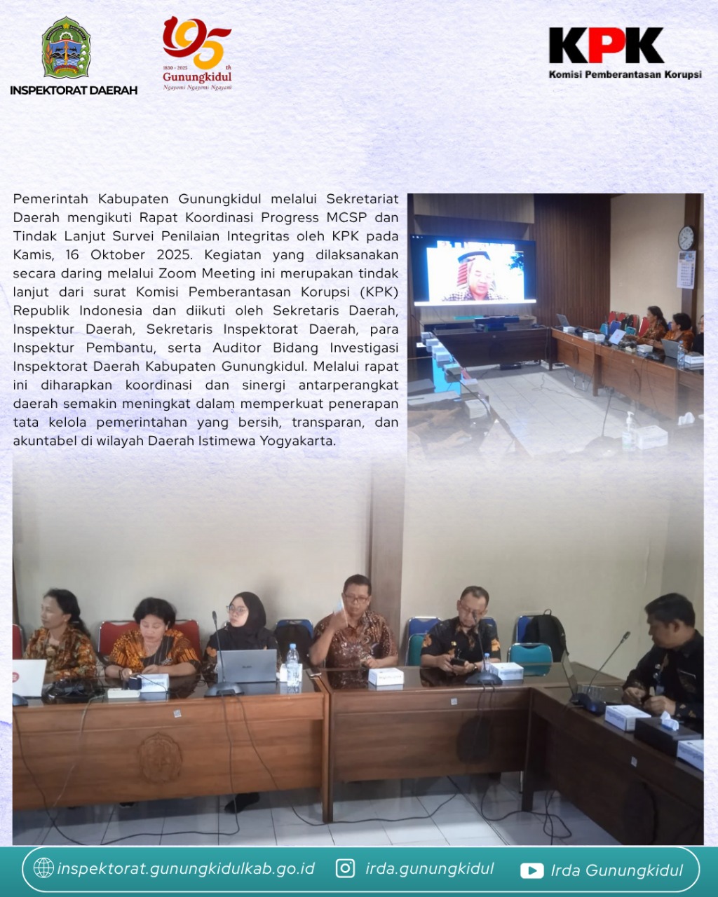 Wonosari, Kamis (16/10/2025) — Pemerintah Kabupaten Gunungkidul melalui Sekretariat Daerah mengikuti Rapat Koordinasi Progress MCSP dan Tindak Lanjut Survei Penilaian Integritas oleh KPK pada Kamis, 16 Oktober 2025. Kegiatan yang dilaksanakan secara daring melalui Zoom Meeting ini merupakan tindak lanjut dari surat Komisi Pemberantasan Korupsi (KPK) Republik Indonesia dan diikuti oleh Sekretaris Daerah, Inspektur Daerah, […]