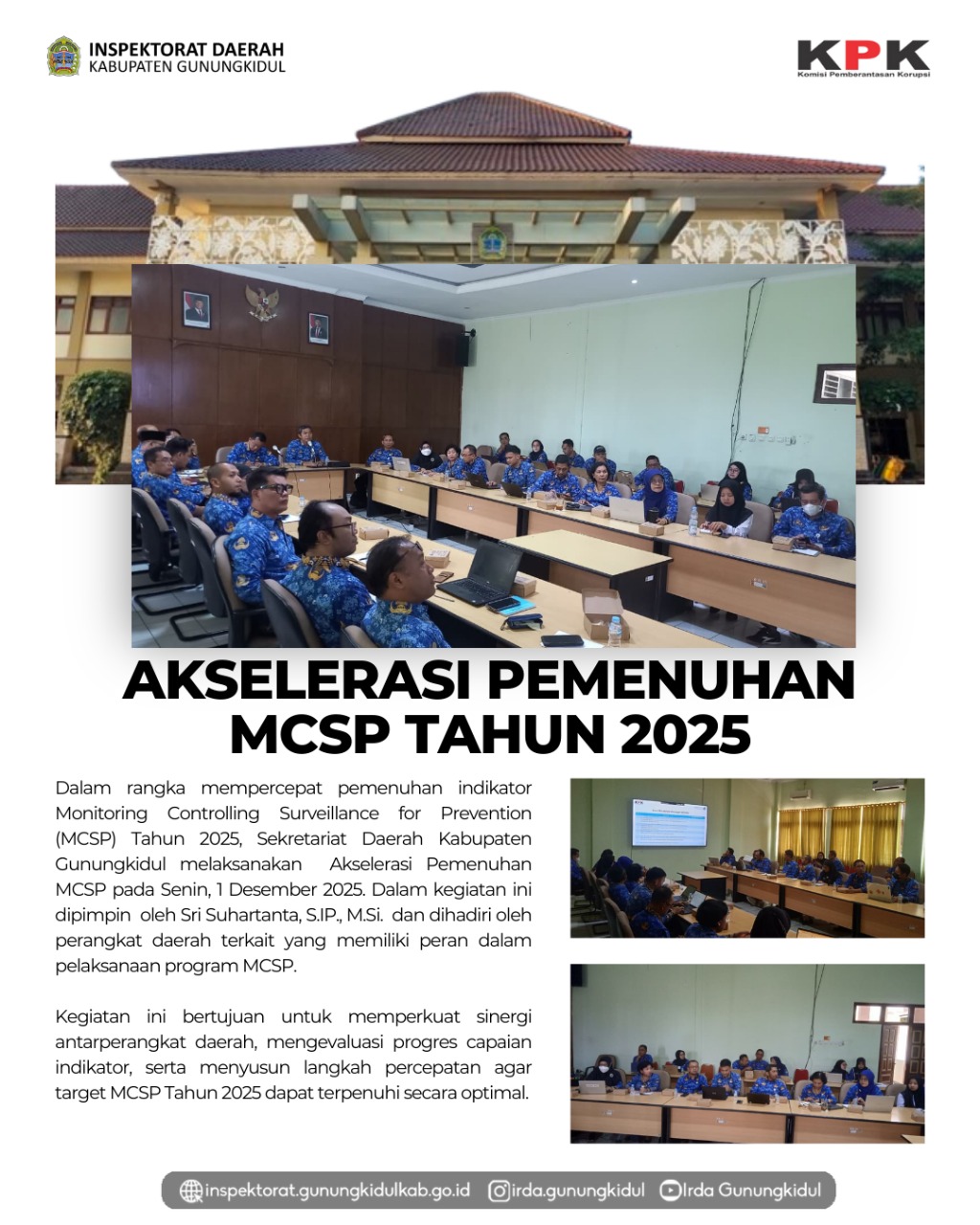 Wonosari, Senin (01/12/2025) — Dalam rangka mempercepat pemenuhan indikator Monitoring Controlling Surveillance for Prevention (MCSP) Tahun 2025, Sekretariat Daerah Kabupaten Gunungkidul melaksanakan Akselerasi Pemenuhan MCSP