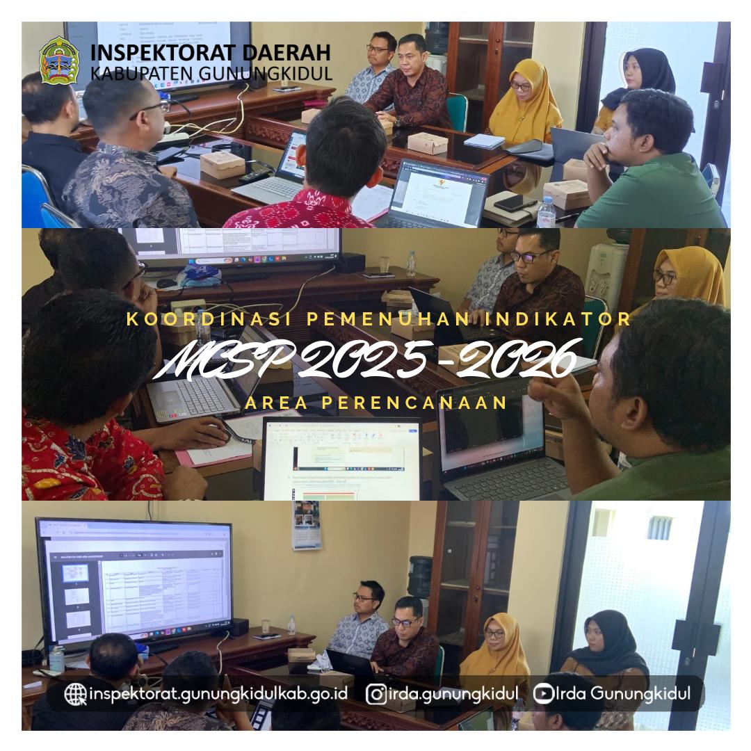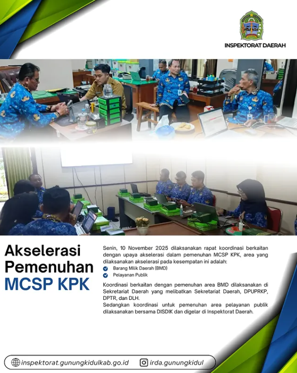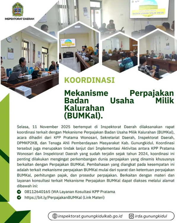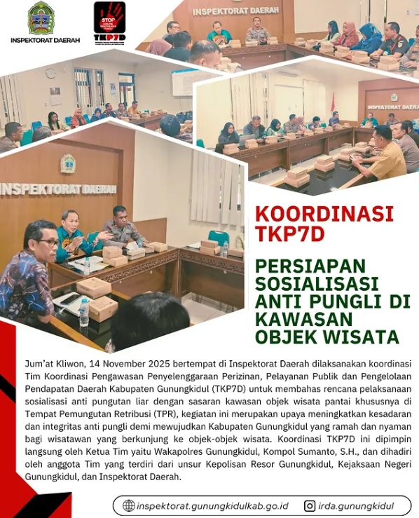 Wonosari, Jumat (14/11/2025) — Bertempat di Inspektorat Daerah dilaksanakan koordinasi Tim Koordinasi Pengawasan Penyelenggaraan Perizinan, Pelayanan Publik dan Pengelolaan Pendapatan Daerah Kabupaten Gunungkidul (TKP7D) untuk