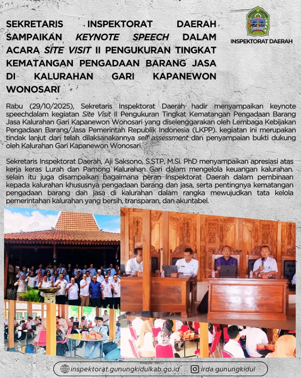 Wonosari, Rabu (29/10/2025) — Sekretaris Inspektorat Daerah Kabupaten Gunungkidul, Aji Saksono, S.STP., M.Si., Ph.D., hadir dan memberikan keynote speech dalam kegiatan Site Visit II Pengukuran Tingkat Kematangan Pengadaan Barang/Jasa Kalurahan Gari, Kapanewon Wonosari, yang diselenggarakan oleh Lembaga Kebijakan Pengadaan Barang/Jasa Pemerintah Republik Indonesia (LKPP). Kegiatan ini merupakan tindak lanjut dari pelaksanaan self-assessment dan penyampaian bukti […]