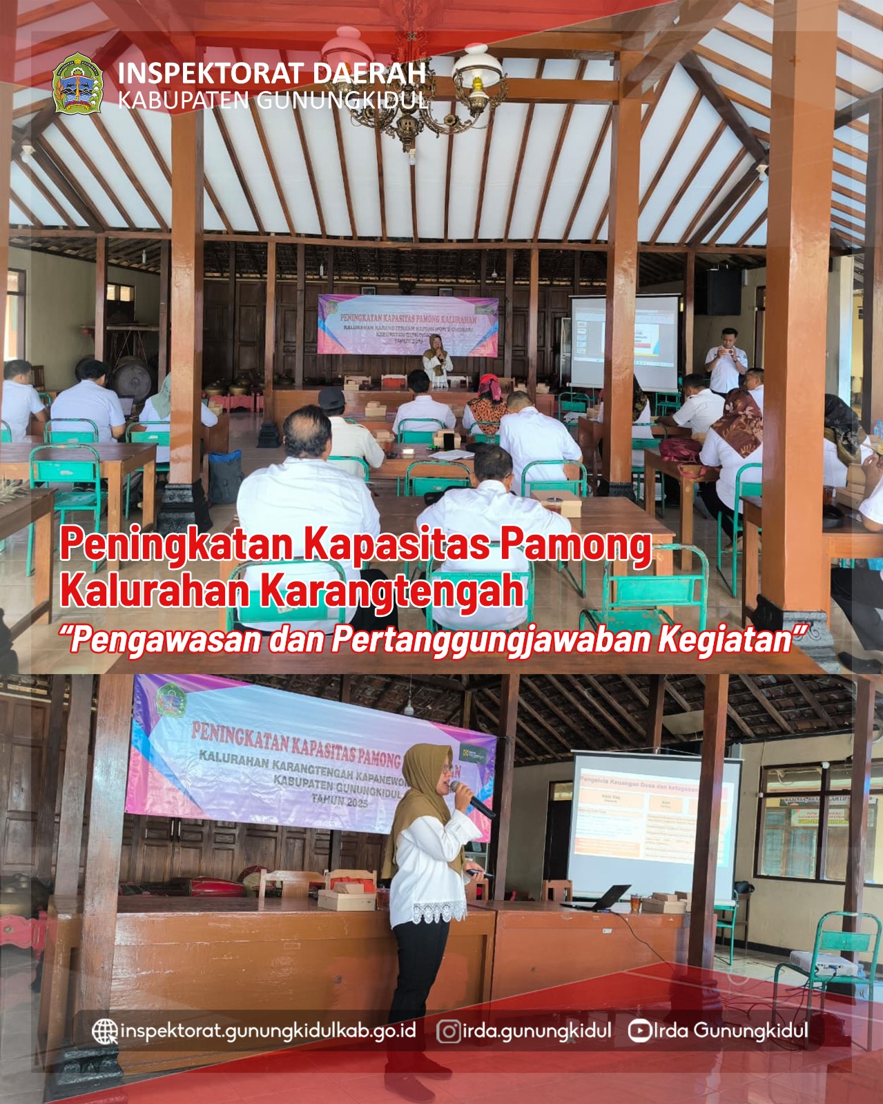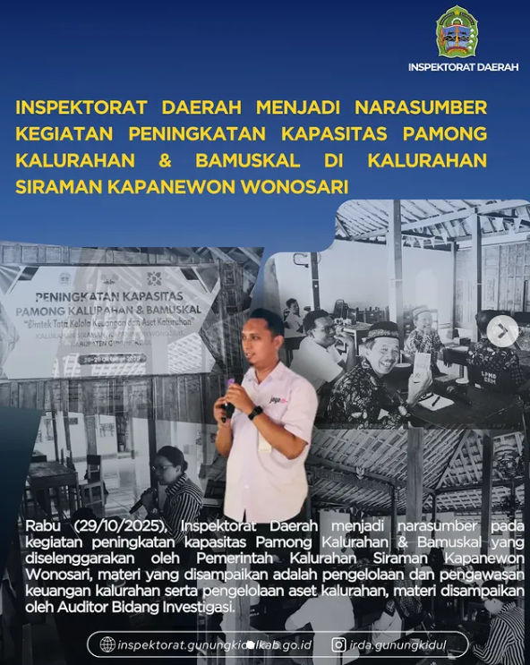 Wonosari, Rabu (29/10/2025) — Inspektorat Daerah menjadi narasumber pada kegiatan peningkatan kapasitas Pamong Kalurahan & Bamuskal yang diselenggarakan oleh Pemerintah Kalurahan Siraman Kapanewon Wonosari, materi yang disampaikan adalah pengelolaan dan pengawasan keuangan kalurahan serta pengelolaan aset kalurahan, materi disampaikan oleh Auditor Bidang Investigasi. Penjelasan mengenai pengelolaan keuangan kalurahan mencakup seluruh kegiatan mulai dari perencanaan, pelaksanaan, […]